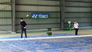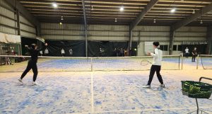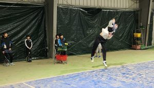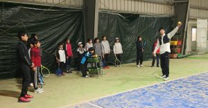 午前中の大人クラスでは11名参加、大学日本一のテクニックや高速サーブ、ストロークを体験、最後は楽しくダブルスの試合をしました。